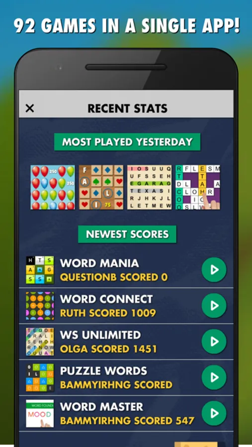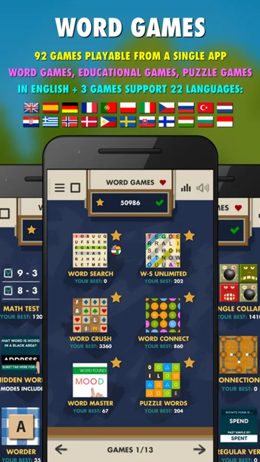 Play more than 90 word search, spelling, guessing, educational and casual games from a single app! Play as a single player or challenge people from all around the world in our Word Games app!
