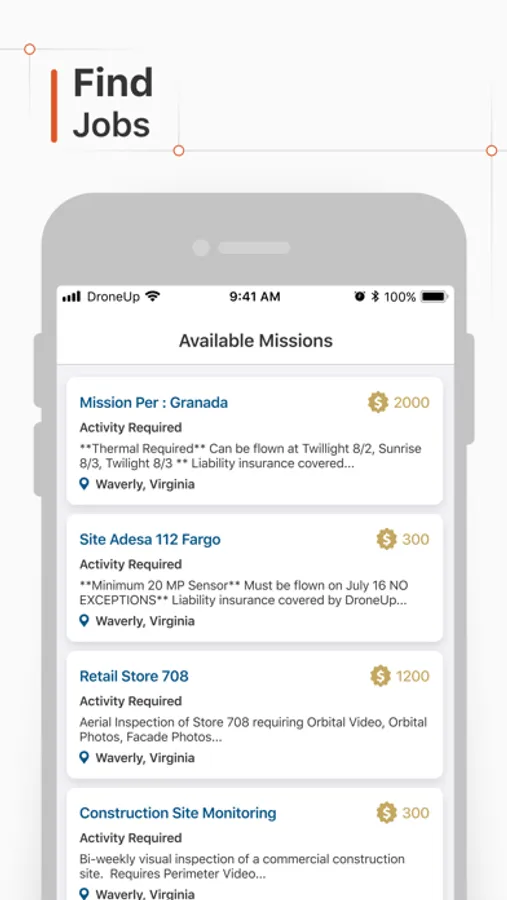 This app is intended for drone pilots who want to check airspace and receive notices of available drone work. DroneUp secures the work and pushes notices of available missions to pilots who have this app. Pilots can define the locations they want to work and register their qualifying credentials and skills. Once claimed by a pilot through this app, DroneUp provides secure mission chat with mission coordinators at the home base. We also provide free liability insurance for every mission.