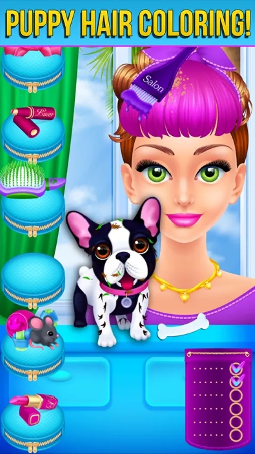 Level 8 : Puppy pet salon makeover!! Get ready with your puppy, color hair and play with pet toys.