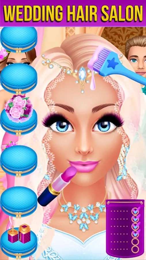 Level 7 : Wedding dress-up, hair and make-up salon. Put on wedding veil, jewelry and much more!
