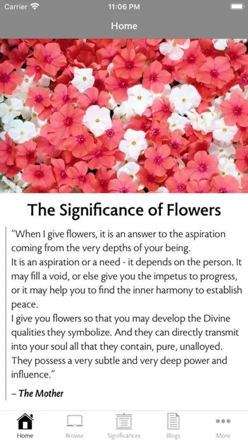 The information on this app has been compiled by Narad (Richard Eggenberger), a long-time member of the Sri Aurobindo Ashram and Auroville. Narad, who is a musician, poet, landscaper, and horticulturist, was given the task of creating the beautiful Matrimandir gardens by the Mother in 1969. He also worked personally with the Mother on the spiritual significance of flowers and edited the book 'Flowers and Their Messages'.