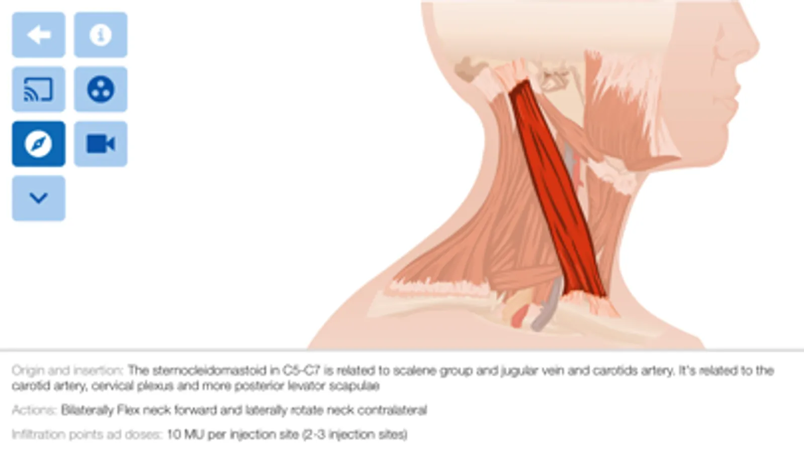 This App is a guidance for a better understanding about how to use the ultrasound technique as a guidance to infiltrate Botulinum Toxin in the muscles involved in cervical dystonia and in Parotid and Submandibular glands.