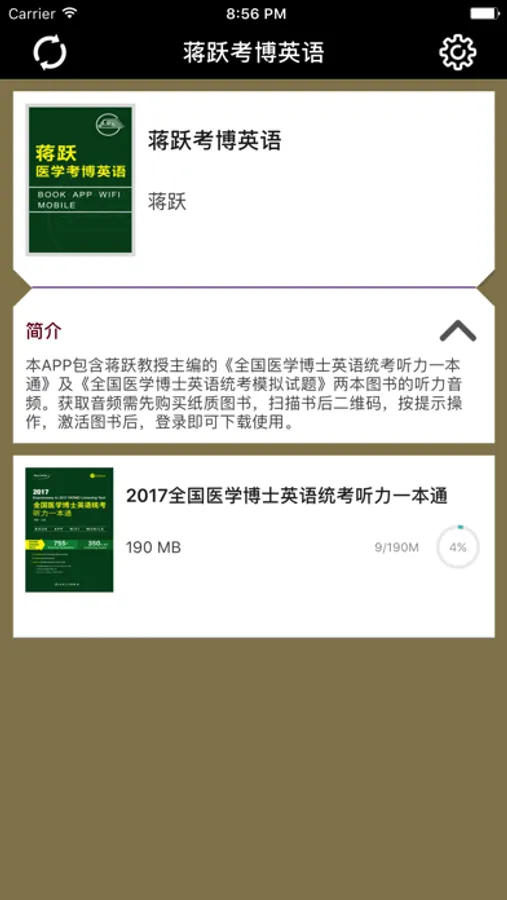 本APP包含蒋跃教授主编的《全国医学博士英语统考听力一本通》及《全国医学博士英语统考模拟试题》两本图书的听力音频。获取音频需先购买纸质图书,扫描书后二维码,按提示操作,激活图书后,登录即可下载使用。