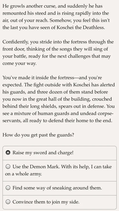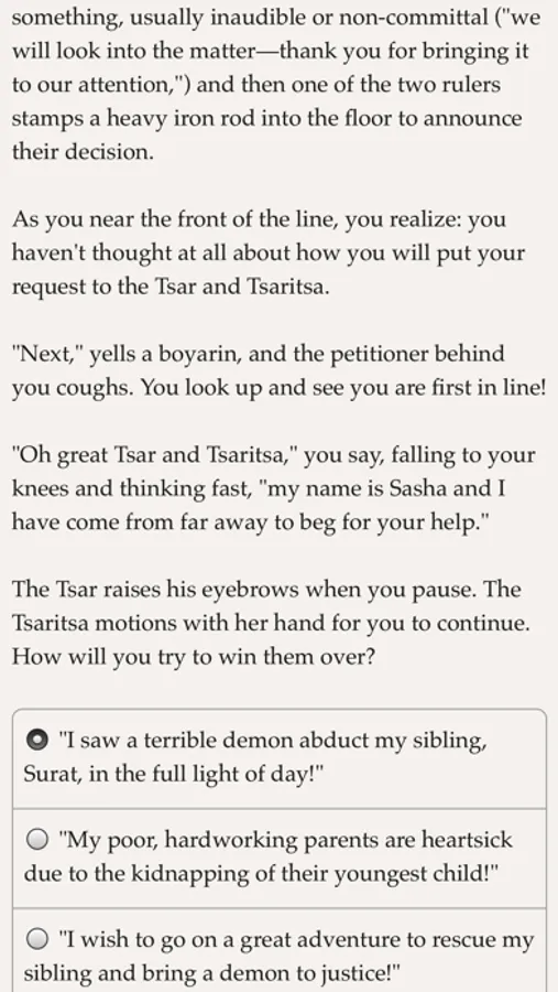 "Demon Mark: A Russian Saga" is a 200,000-word interactive fantasy novel by Vlad Barash and Lorraine Fryer, steeped in Russian folklore. It's entirely text-based, without graphics or sound effects, and fueled by the vast, unstoppable power of your imagination.