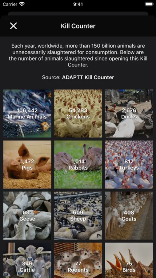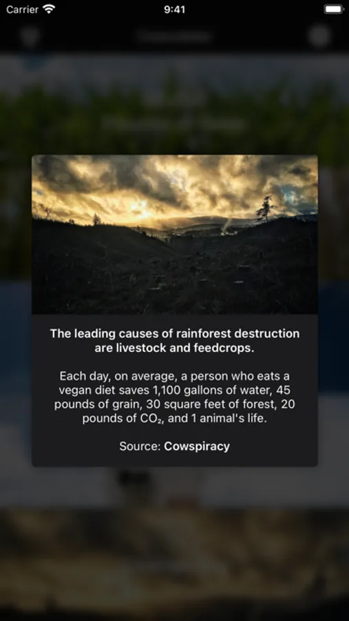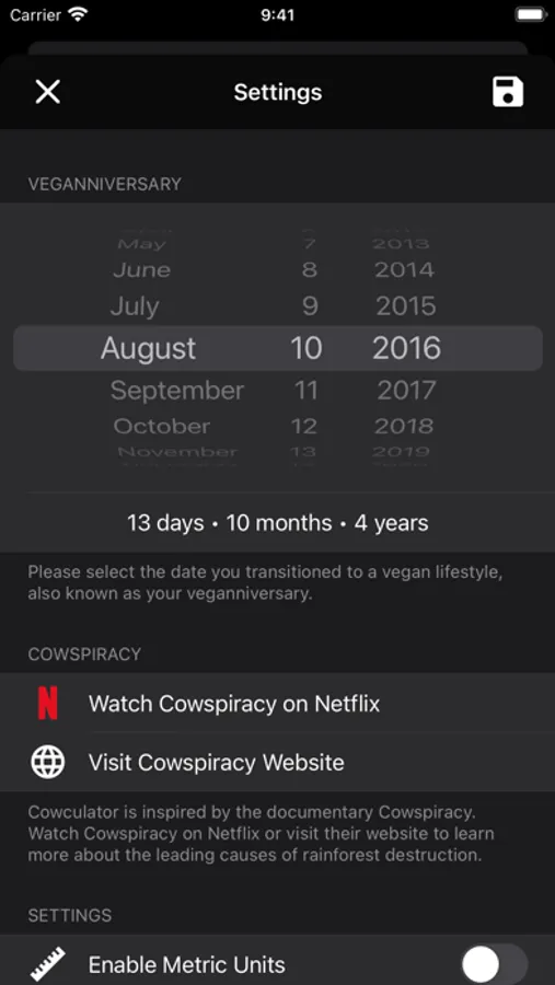 By simply entering your veganniversary (the day you became vegan) Cowculator calculates how much water, grain, forested land, CO2 equivalent, and animal lives you have saved by going vegan.