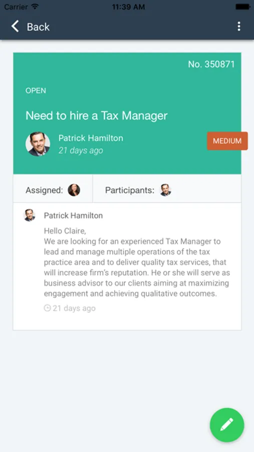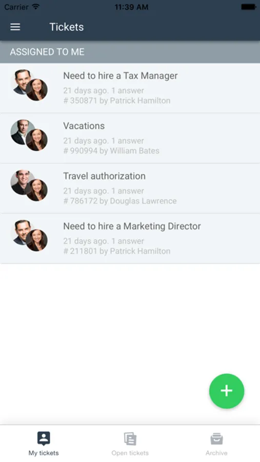 Resolve iT App is a great solution for following up on work requests. Is a case based software that allows people in an organization create specific requests to their colleagues. Each new request has a ticket number, an open status and an assignation that depending on it's type of request could be either a person or simple workflow.