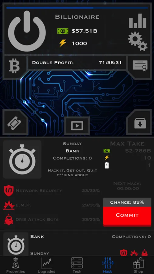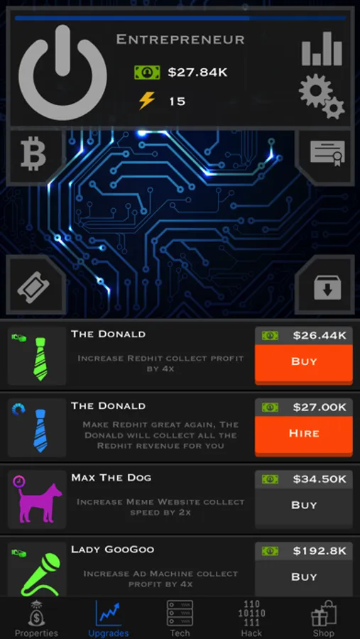 Grow an empire for the new age using technology. Acquire properties and hire people to do your job for you. Hack everything you touch while building up your network and wealth. Can you control the largest social network in the world?