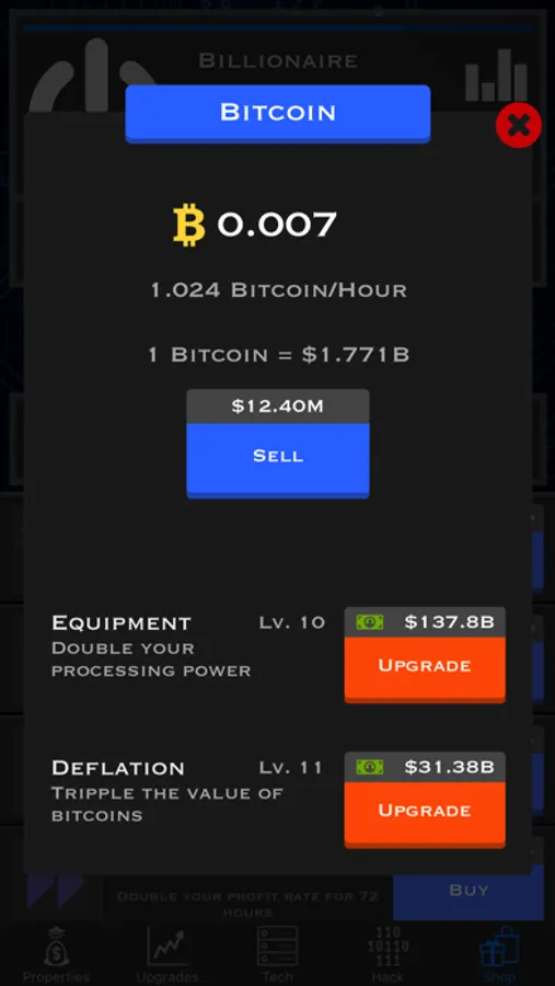As you progress through your career you will be able to mine bitcoins. Upgrade your equipment to mine faster and faster. Influence the price of bitcoins, cause deflation, and raise the prices for everyone!