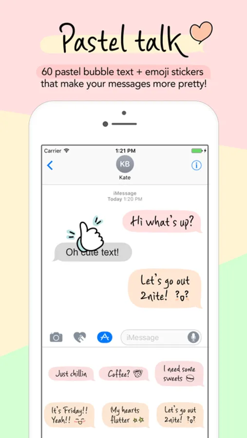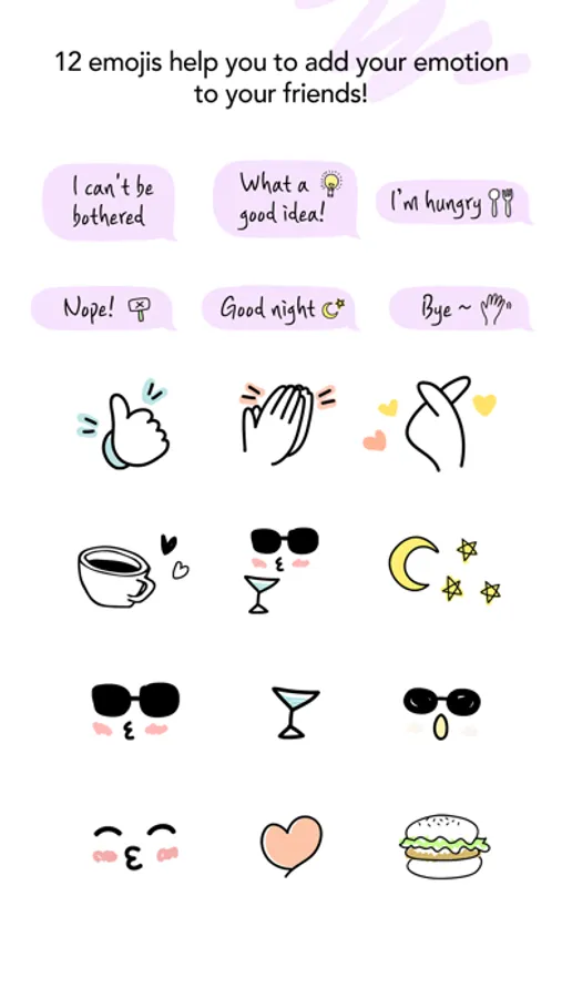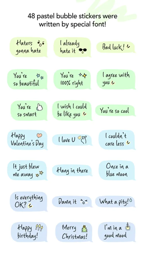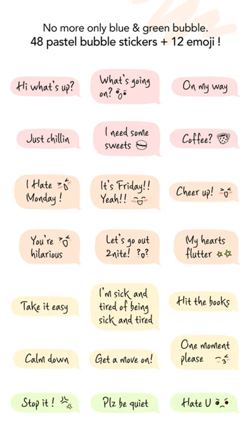 Here's newly launched pastel colored bubbles!! It includes 48 expressions and 12 cute emojis. 48 expressions are the most commonly used words in daily life. You can use these stickers everyday and in any special moment!