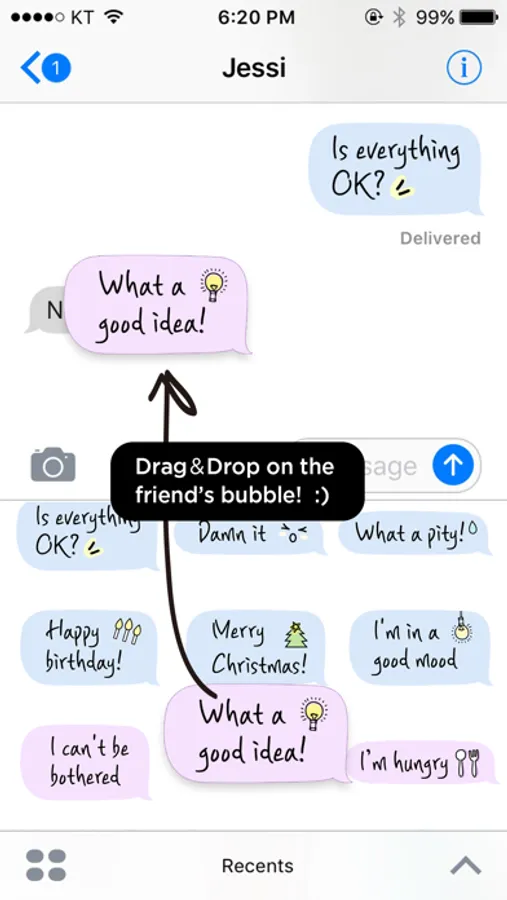 • You can peel and place them on anything in your conversation – bubbles, images, or even other stickers.