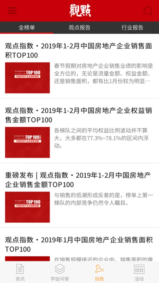 观点机构是中国领先的行业信息、数据和分析供应商,是覆盖包括住宅、写字楼、商业零售、不动产投资、资本金融、物业服务、产业园区、物流、城市更新、文旅康养等相关产业链的行业专业机构。