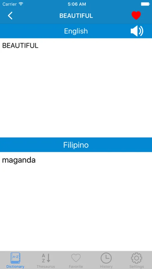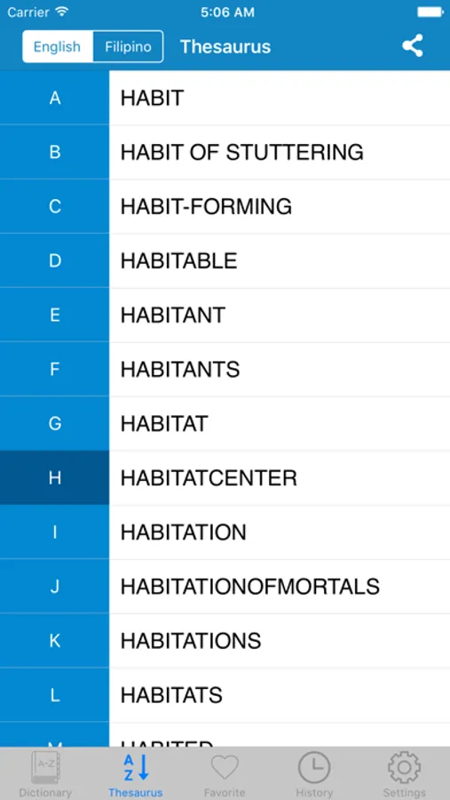 Other than the Filipino to English translation and English to Filipino translation, the app also brings you the history feature where you can find the meanings of your recently searched words as well as the Thesaurus feature where you can search English words as well as Filipino words in alphabetical order and find out their meanings.