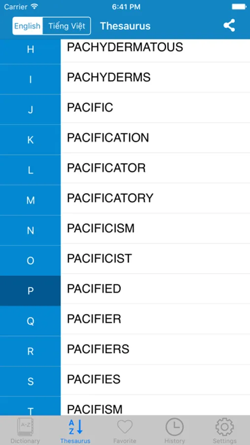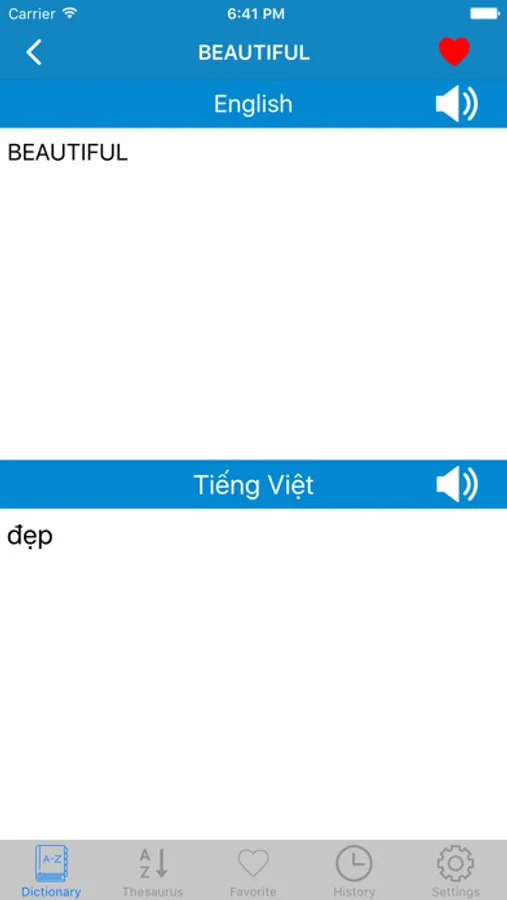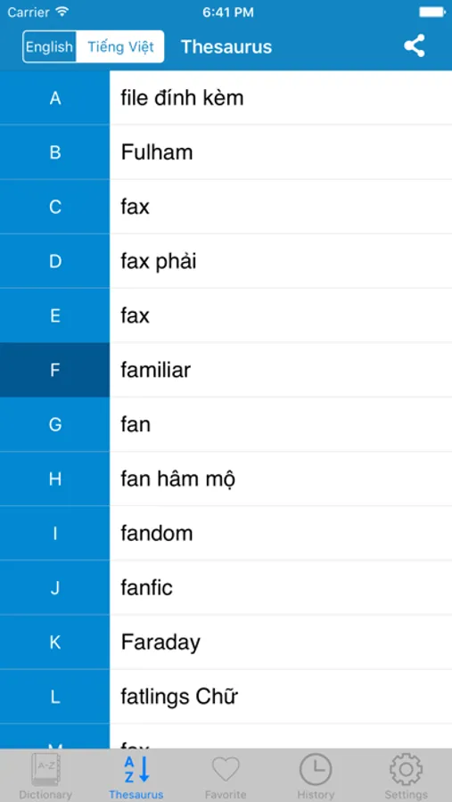 Other than the Vietnamese to English translation and English to Vietnamese translation, the app also brings you the history feature where you can find the meanings of your recently searched words as well as the Thesaurus feature where you can search English words as well as Vietnamese words in alphabetical order and find out their meanings.