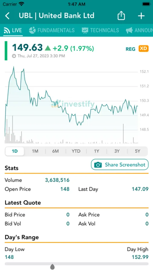 With Investify, you can follow PSX stock prices in real-time, manage your portfolio across multiple devices, open a demo trade account for free, and play around with interactive charts with historical data. You can study in-depth financials and fundamentals, analyze updated technical data, watch KSE market live, and sort by Shariah Compliant stocks to see Islamic shares.