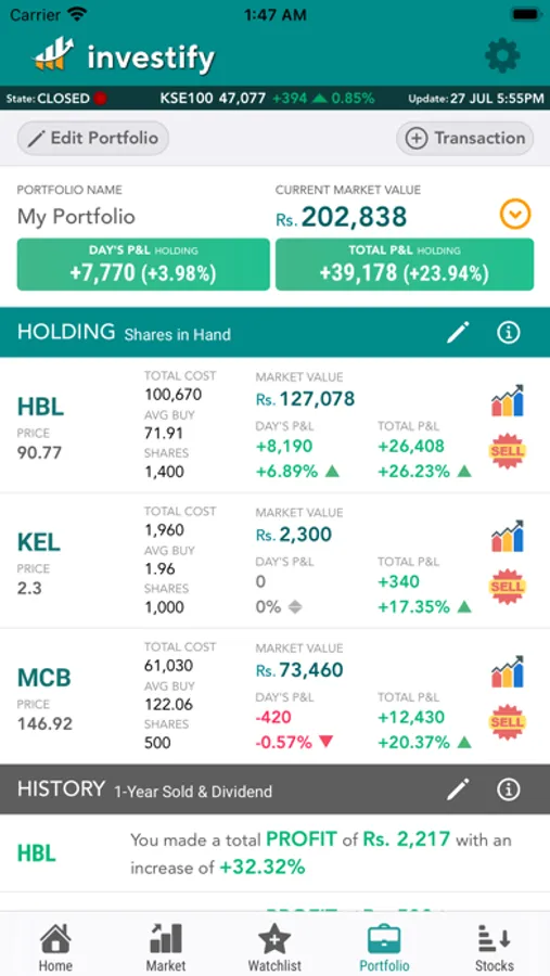 Add your stocks to the portfolio through virtual buy and sell transactions. Your portfolio is synced with your Investify account and available instantaneously on all logged in devices. Track daily and total returns for your holdings, as well as get complete profit and loss from sold transactions (realized history) and dividends.