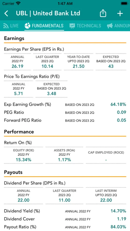 Investify PSX App covers many different financial indicators for the majority of symbols it covers, like Earnings Per Share (EPS), Price to Earnings Ratio (P/E Ratio), PEG, Profit Margins, Return on Equity (ROE), Return on Assets (ROA), Dividends and Yield, Book Value, PBV, Current & Quick Ratio, and much more.