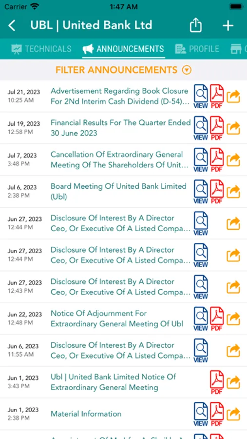 See all company announcements from the Pakistan Stock Market: Financial results, Board Meetings, Insider trades and AGM. You can also sort announcements based on type.