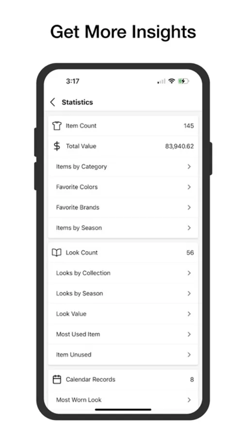 * Get detailed statistics result of your closet. Know your favorite color/brand/look.