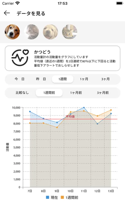 グラフで活動量・ジャンプ数を確認でき、それらが低下した場合にはアラートでお知らせしますので、体調の変化にいち早く気づけます。