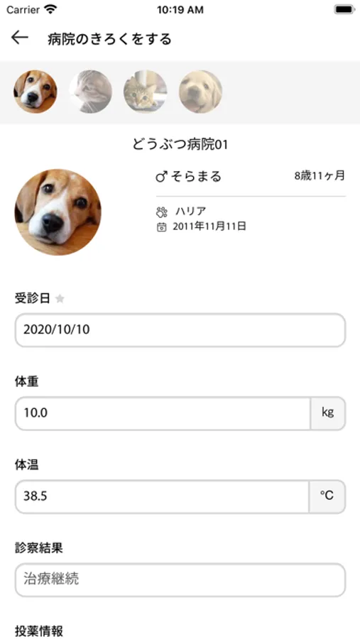 体重・体温・診察結果など動物病院でのコメントを記録することができます。