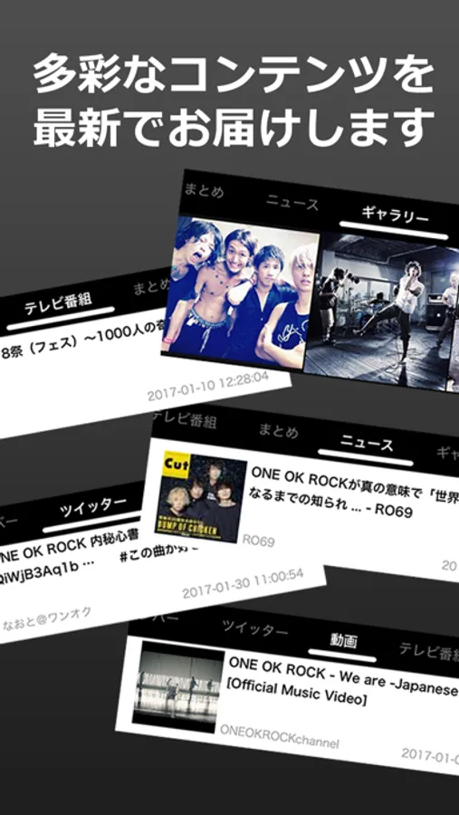 ワンオクCOLLECTはONE OK ROCK(ワンオクロック)のニュースや動画、画像、ツイート、テレビ番組情報、メンバーの最新情報をまとめたアプリです。完全無料で毎日新しいニュースをファンの方々に全てお届けします。