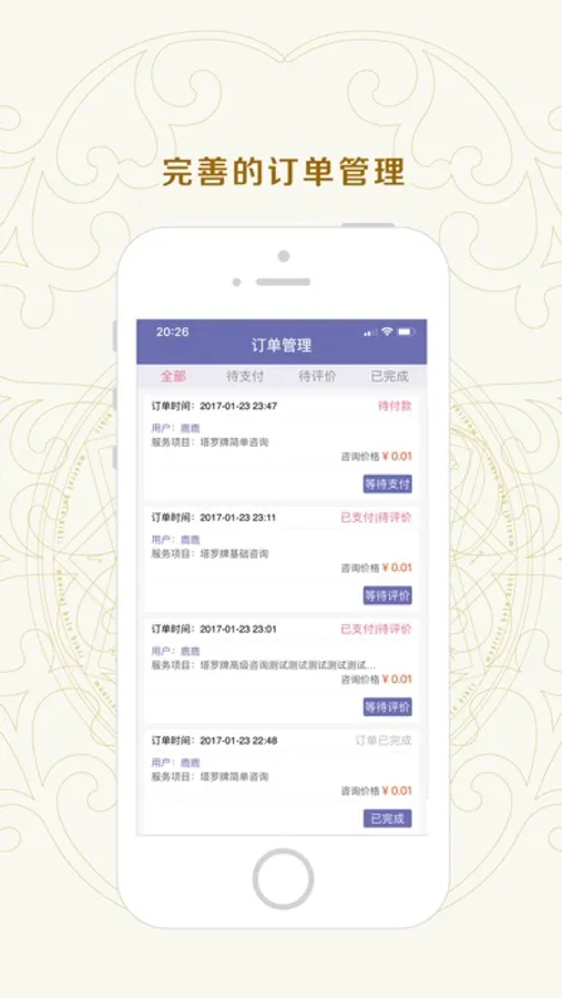 由咨询师发起订单,掌握自主权,不会发生客户强拍订单索取服务的情况,订单流程全部记录,双重备份,历史交易随时可查,服务后客户自主评价,只有评价和评语是显示的,认可度和满意度完全匿名的,做到公平公正。