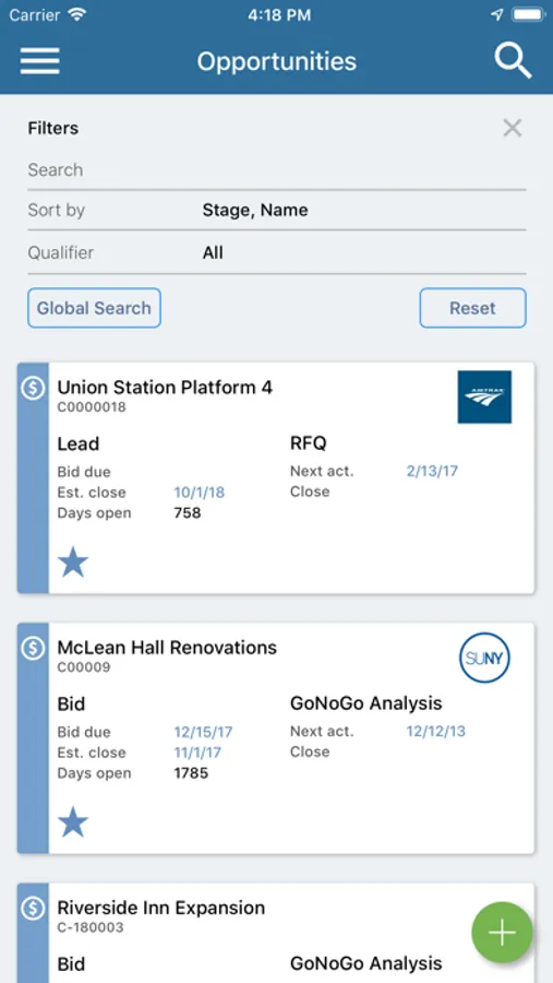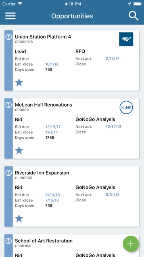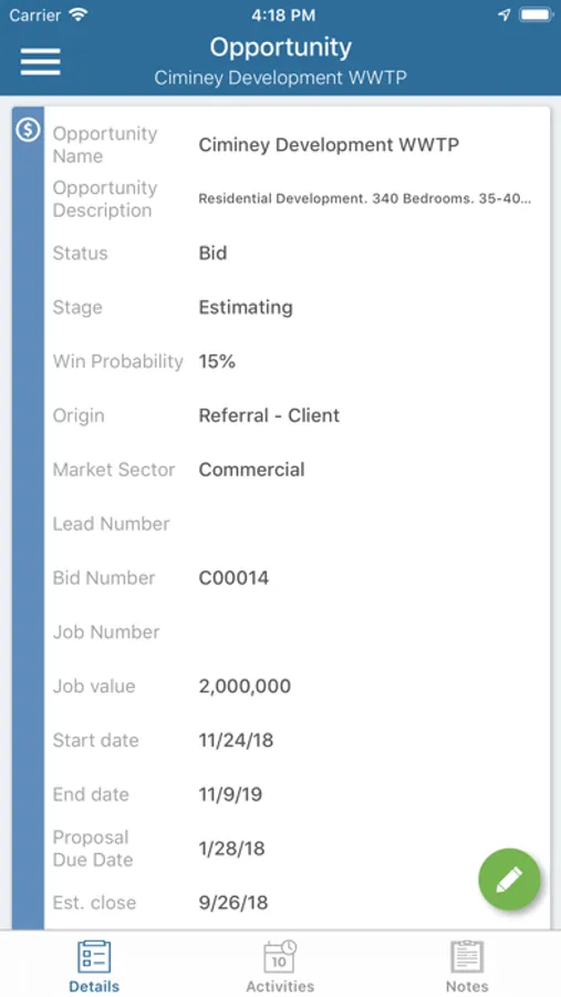 * Add and update Opportunities with essential data like Status, Due Dates, Values, Notes and Activities.