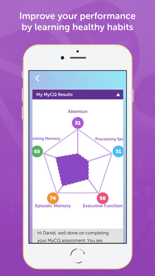 MyCQ monitors your cognition producing detailed reports. It assesses the key five cognitive domains; Executive Function, Attention, Episodic Memory, Processing Speed and Working Memory. These control the way you think and behave through your ability to plan, solve problems, recall, concentrate, and act with speed and accuracy.