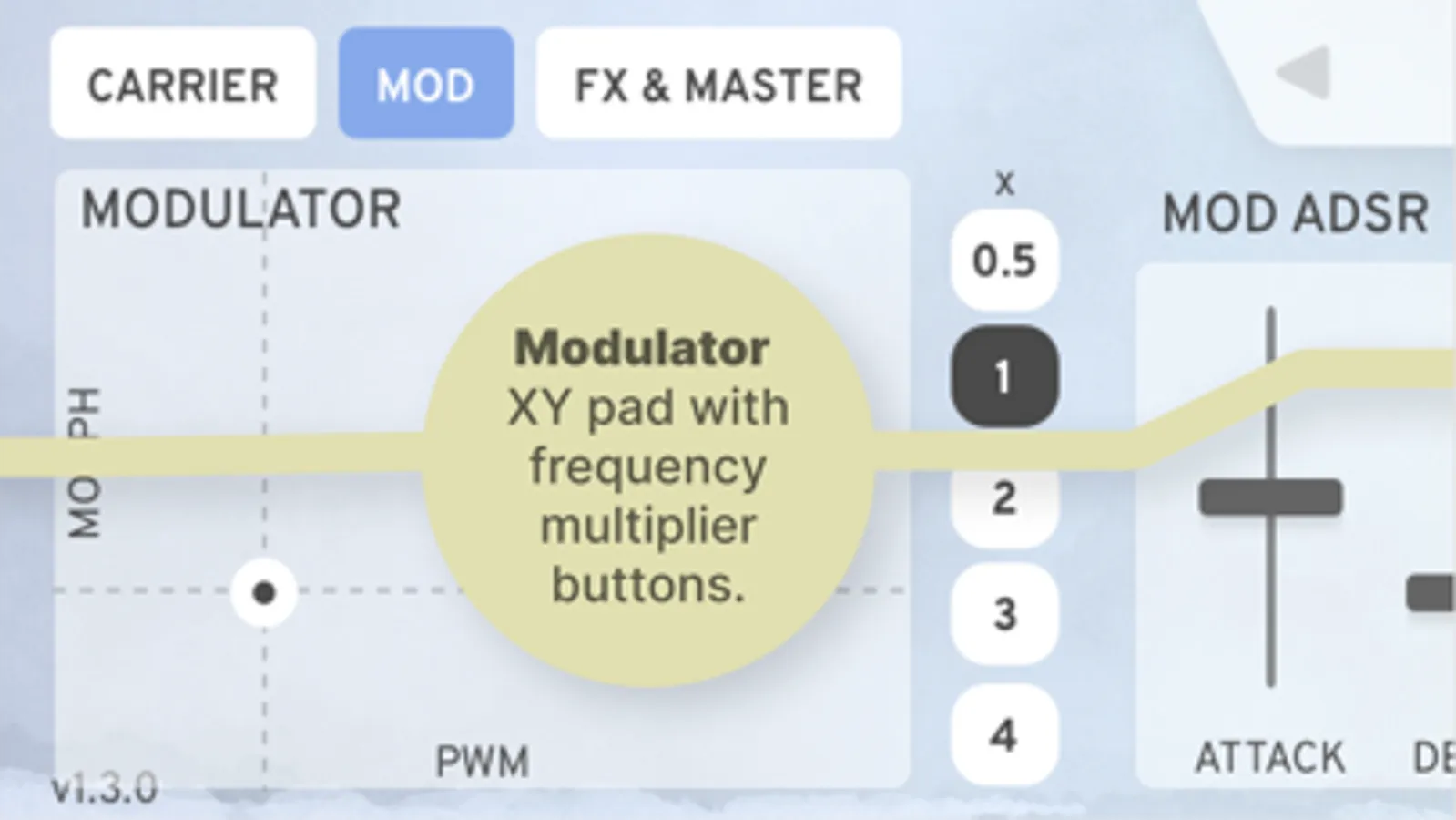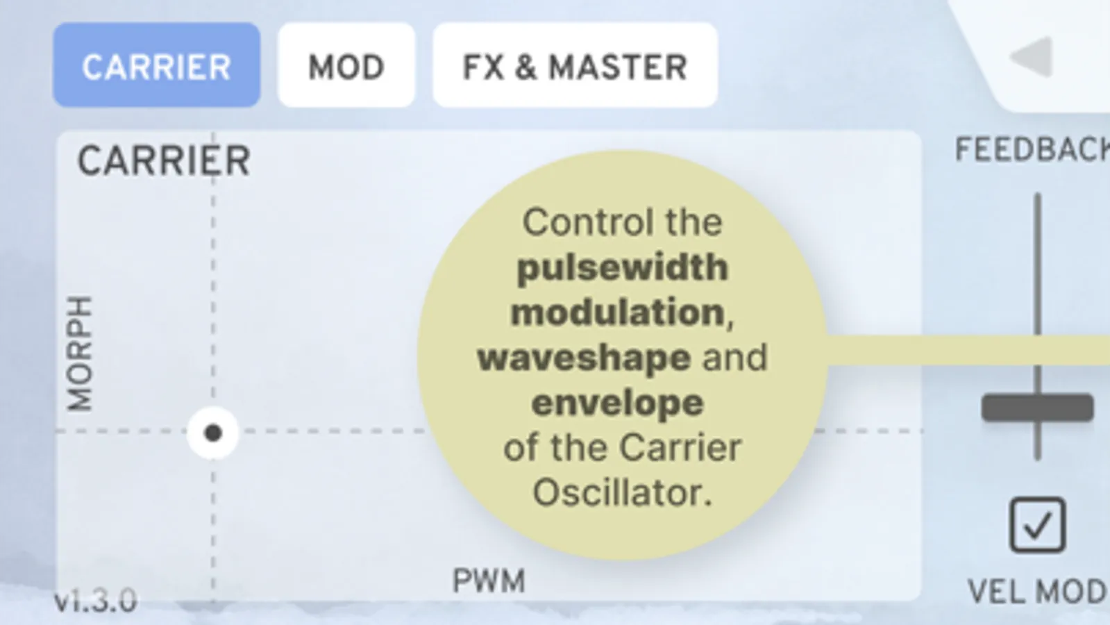 • FM Feedback, Filter, ADSR Attack and Volume can be modulated by velocity