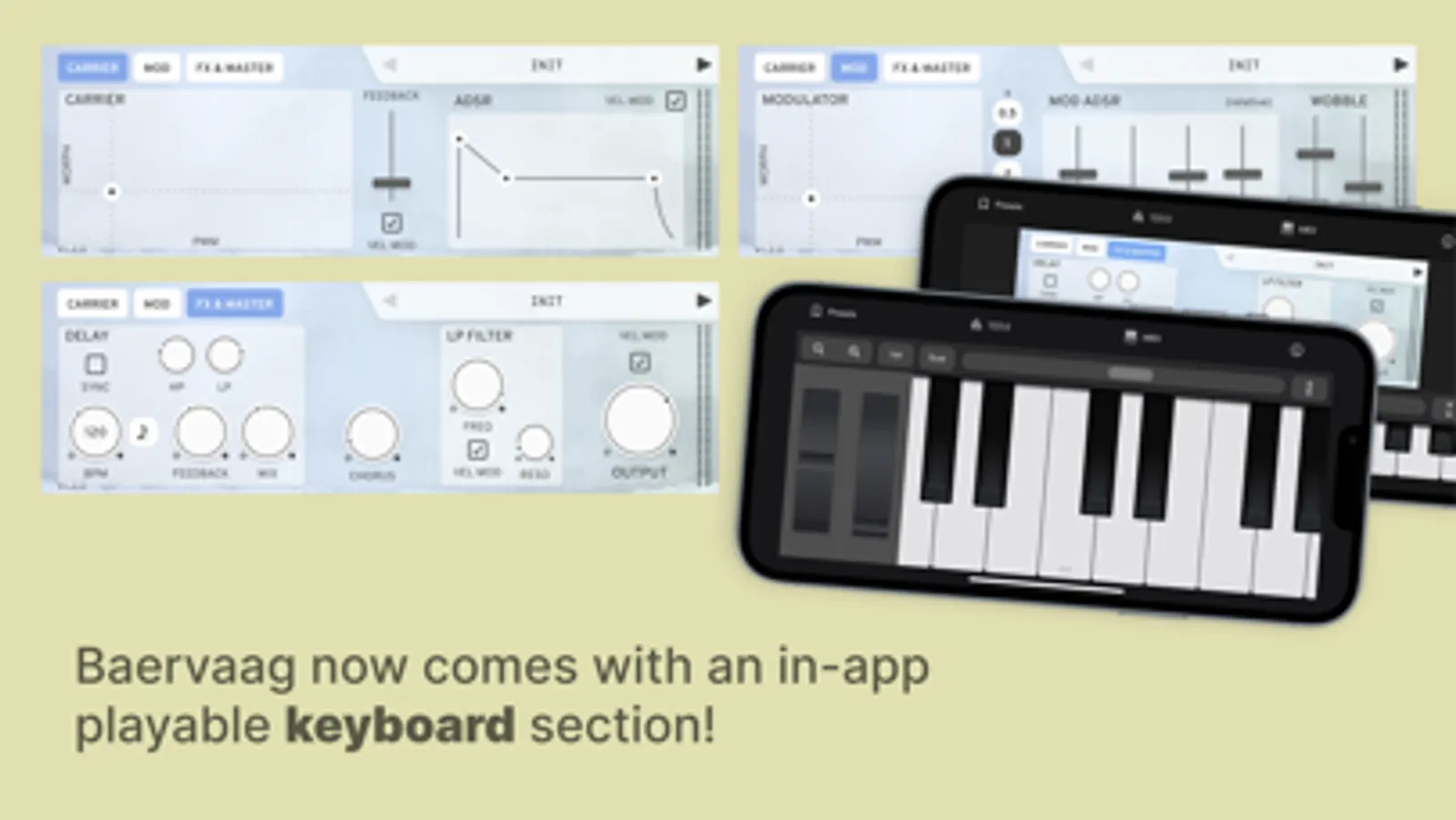 Baervaag brings FM synthesis to the masses! An easy to use but still powerful and tweakable synthesizer, accessible to everyone. Several parameters are sensitive to velocity which makes Baervaag very expressive and fun to play.