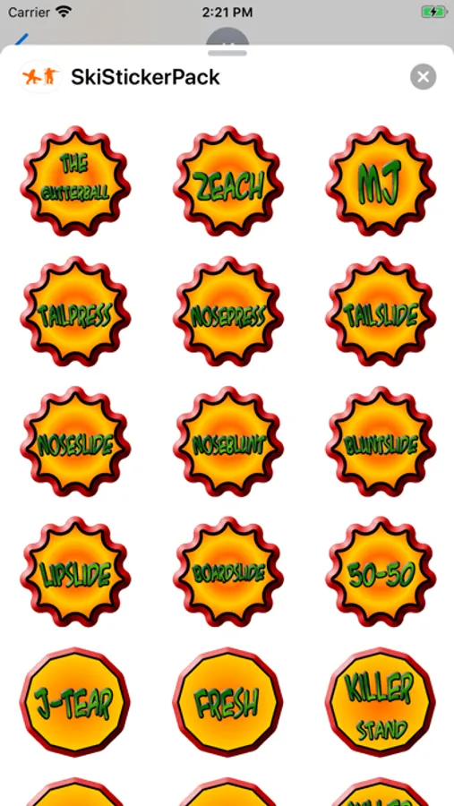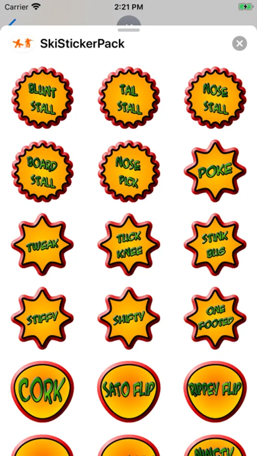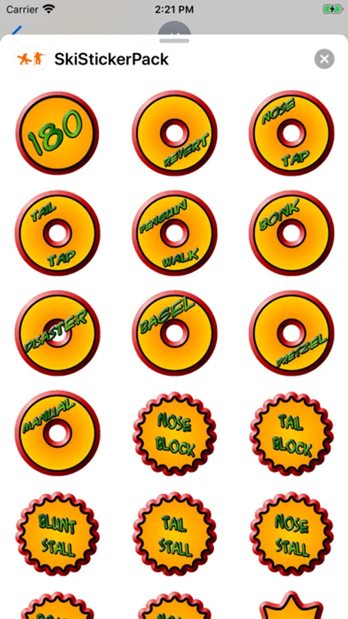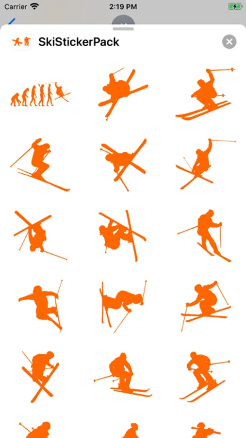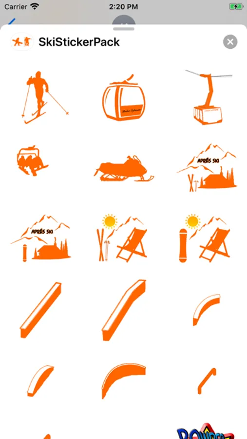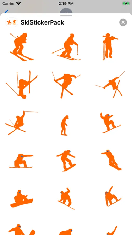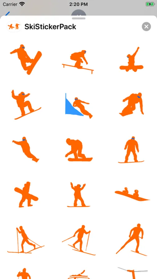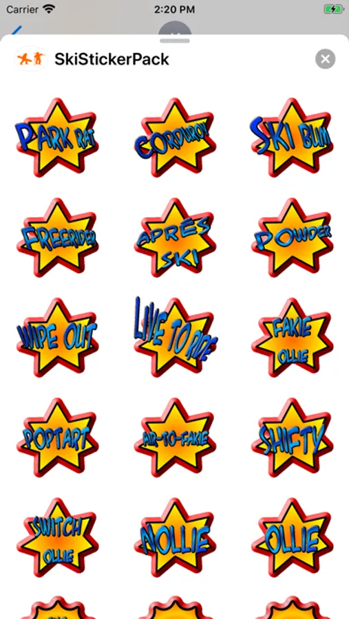 Send a Ski or Snowboard sticker with this sticker pack. Choose from the many still images, freestyle tricks or phrases to stick over messages or pictures, or just send them on their own to represent your achievements and activities on the white stuff.