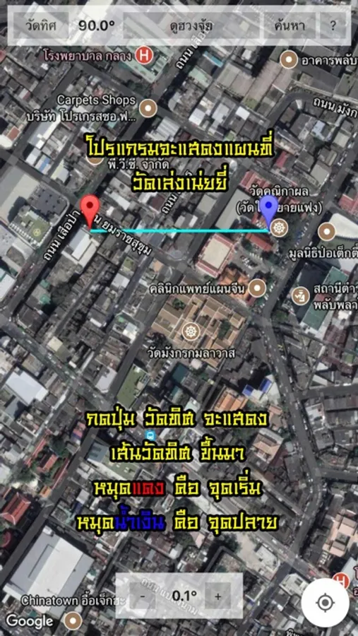การใช้งานเมื่อเปิดโปรแกรมจะแสดงแผนที่ ขึ้นมา เราสามารถค้นหาบ้านอาคารที่ต้องการตรวจสอบฮวงจุ้ย โดยกดปุ่ม ค้นหา หรือ กดปุ่ม My Location หากเลือก ค้นหา ให้พิมพ์ชื่อสถานที่ที่เราต้องการค้นหา จะแสดงสถานที่นั้น กดปุ่ม วัดทิศ จะแสดงเส้นตรงสำหรับวัดทิศทางโดยหมุดแดงจะเป็นจุดเริ่ม และจุดน้ำเงินเป็นจุดปลาย