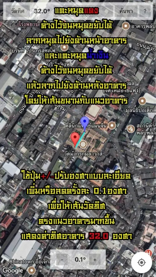 กดหมุดแดงค้างไว้จนหมุดขยับได้ เลื่อนหมุดแดงไปยังตำแหน่งด้านหน้าบ้านอาคาร และกดหมุดน้ำเงินค้างไว้จนหมุดขยับได้ เลื่อนหมุดน้ำเงินไปยังตำแหน่งด้านหลังบ้านอาคาร โดยให้เส้นขนานกับแนวบ้านอาคาร