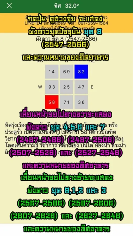 เลื่อนหน้าจอไปทางซ้ายมือ จะแสดงผังดาวยุค 9 (2567-2586) ยุค 1 (2587-2606) ยุค 2 (2607-2626) ยุค 3 (2627-2646) และความหมายของทิศ