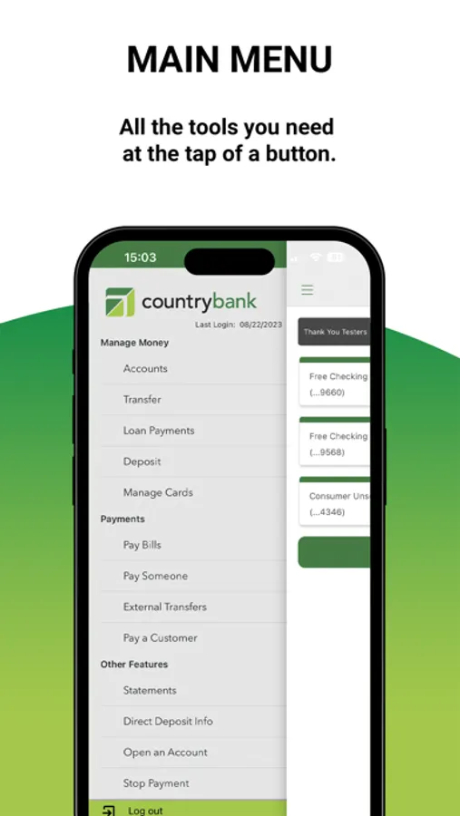 The Country Bank Mobile Banking App allows you to safely and securely access your accounts anytime, anywhere! You can: