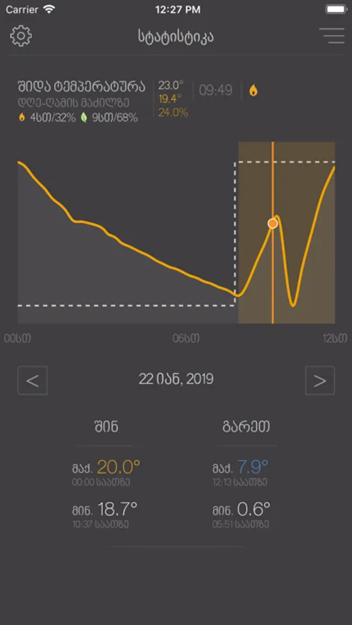 The application offers a detailed statistics of heating system as graphical representations of beautiful charts, based on the data received from the device.
