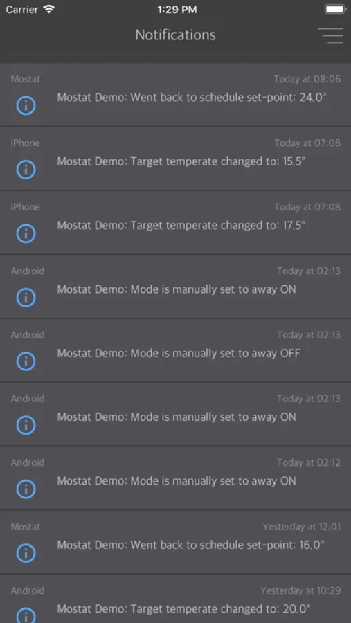 Everything is very simple - there are only two options in the application - temperature control and mode Away.