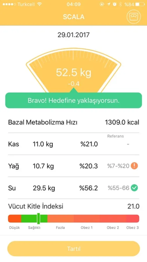 • Scala yağ, kas, su, kemik ağırlığı, bazal metabolizma hızı ve vücut kitle indeksini ölçerek bilgi sunar: