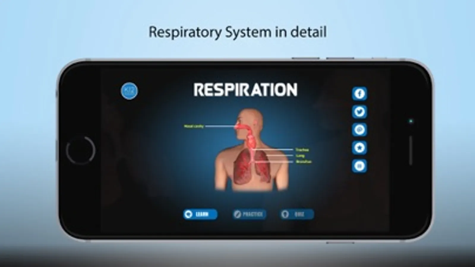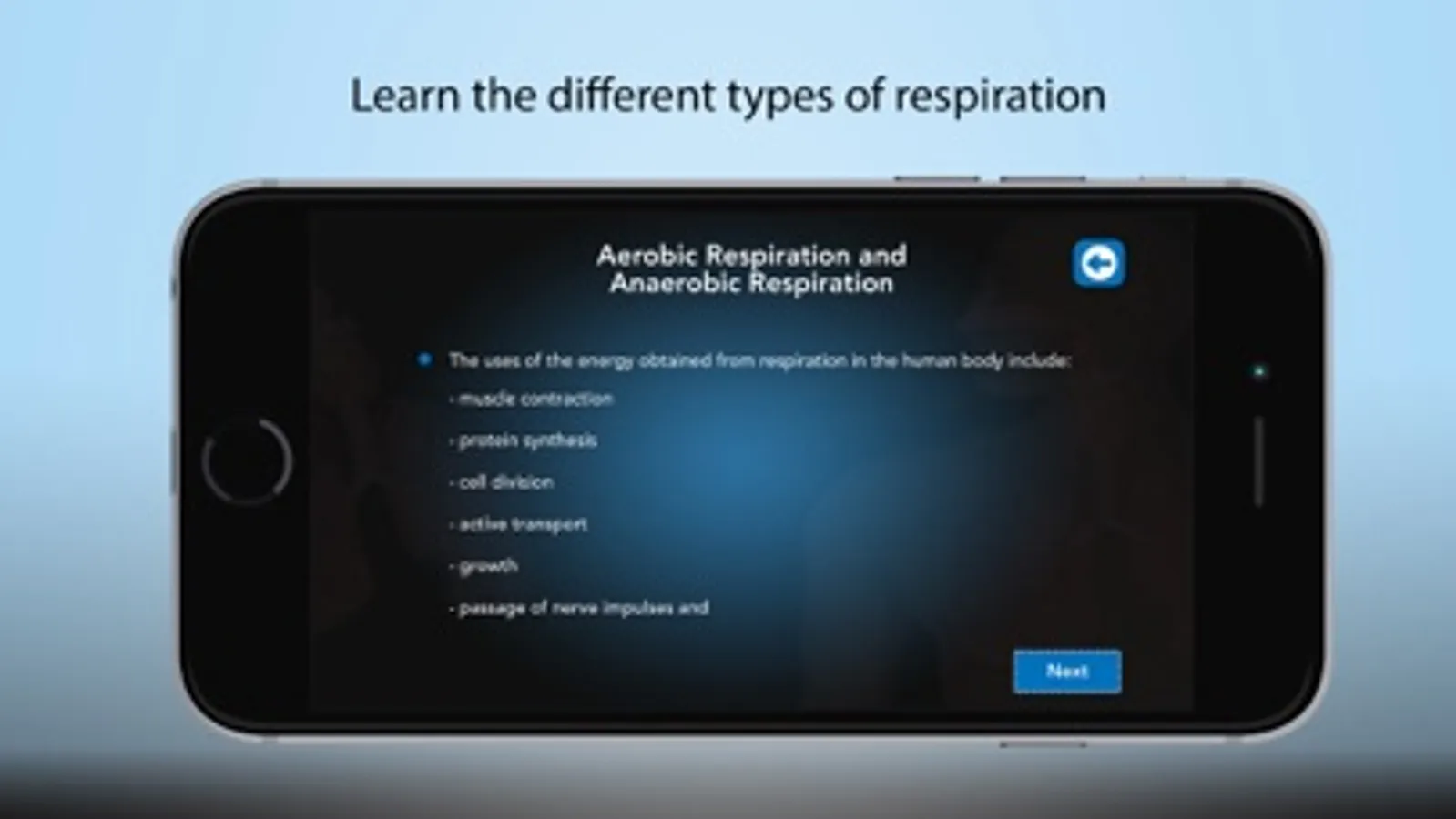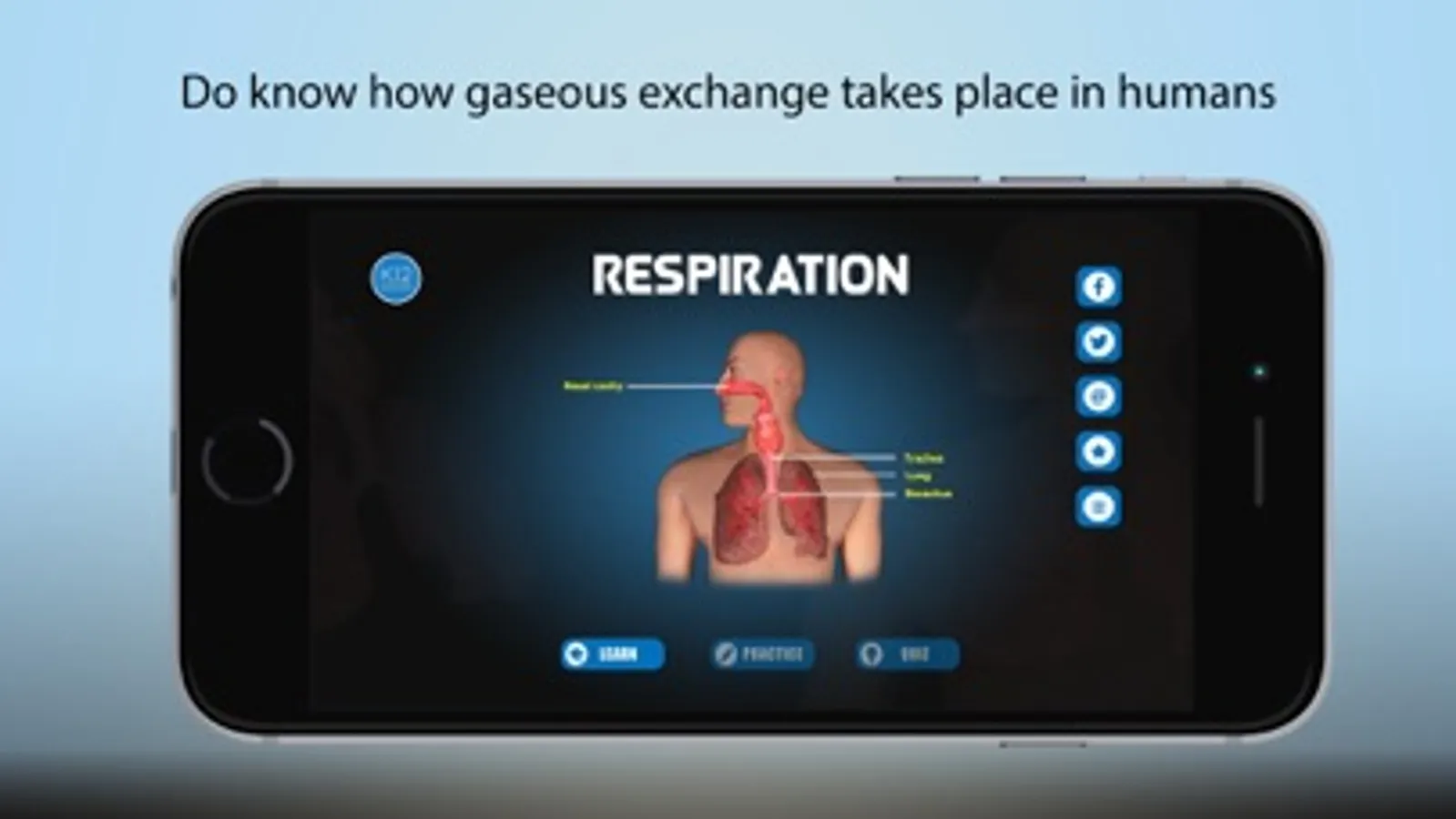 This educational application helps students understand and learn about respiration process, respiration biology, aerobic respiration, anaerobic respiration, gas exchange in the lungs in an easy and engrossing way.