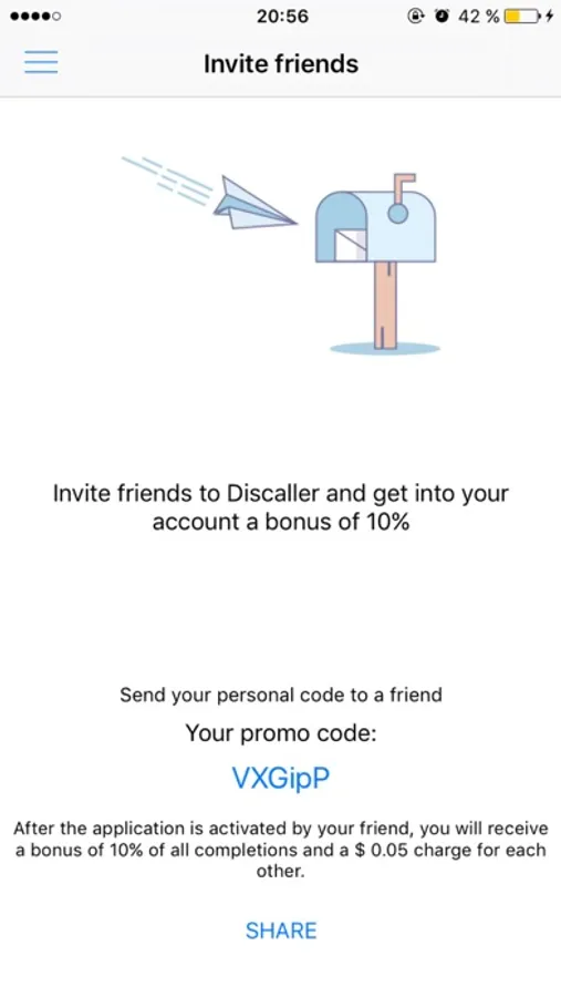Tell your friends about Discaller in the application section “Bonus program” and we will deposit $ 0.20 on your account: