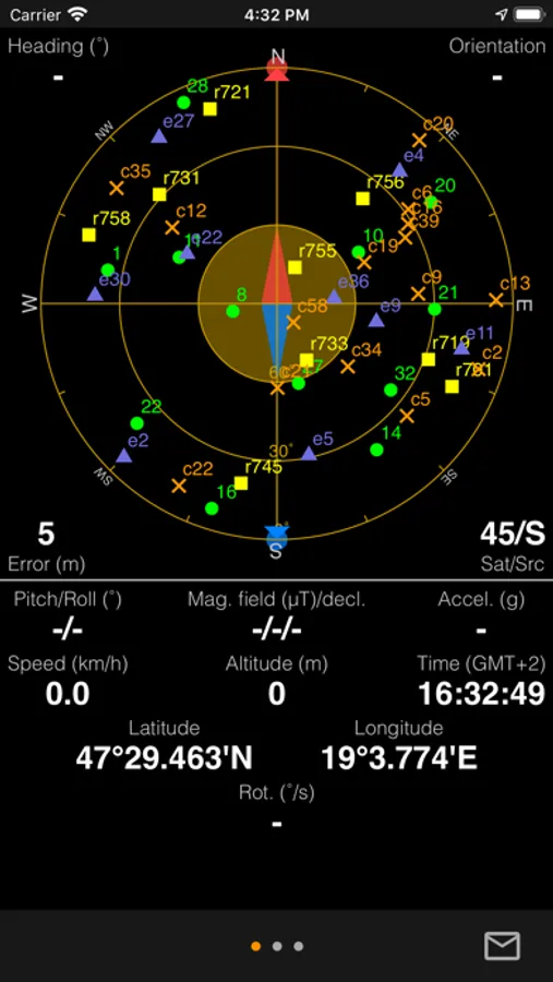 Displays all the GPS and sensor data you ever were curious about: position of GPS and GLONASS satellites, accuracy, speed, acceleration, altitude, bearing, pitch and roll. Find and save your locations based on coordinates or actual position and navigate to them later.