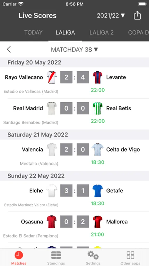Live Scores for La Liga Santander 2023/2024 is the app that will allow you to follow the matches of Football Championship in Spain, even you do not have possibility to watch TV or live stream. It includes a calendar, schedule of matches, standings and scores of LaLiga Santander, LaLiga SmartBank, Copa del Rey and Super Cup. With the application you will not miss a goal or begin of a match, because it will send you a push-notifications. You can select favorite matches and receive notifications only for them. In LaLiga season 2023/24 play the teams: FC Barcelona, Real Madrid, Sevilla FC, Mallorca, Almeria, Osasuna, Espanyol, Rayo Vallecano, Real Sociedad, Cadiz CF, Girona, Atlético de Madrid, Villarreal CF, Elche, Getafe CF, Valladolid, Real Betis, RC Celta, Valencia CF and Athletic Club.