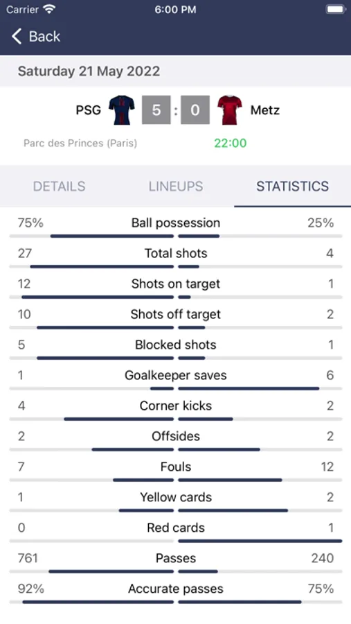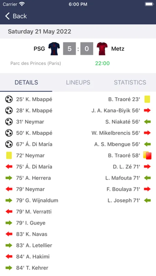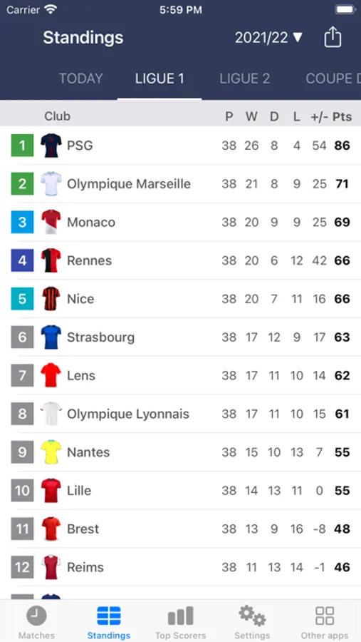 Live Scores for Ligue 1 France 2023/2024 is the app that will allow you to follow the matches of Football Championship in France, even you do not have possibility to watch TV or live stream. It includes a calendar, schedule of matches, standings and scores of Ligue 1 Uber Eats, Ligue 2, Coupe de France and Super Cup. With the application you will not miss a goal or begin of a match, because it will send you a push-notifications. You can select favorite matches and receive notifications only for them. In Ligue 1 season 2023/24 play the teams: OGC Nice, AS Monaco, Paris Saint-Germain (PSG), RC Lens, Toulouse, Stade Rennais FC, Le Havre, Metz, Olympique Lyonnais, Olympique de Marseille , Stade de Reims, FC Nantes, Clermont, LOSC, Montpellier Hérault SC, Stade Brestois 29, FC Lorient, et le RC Strasbourg Alsace.