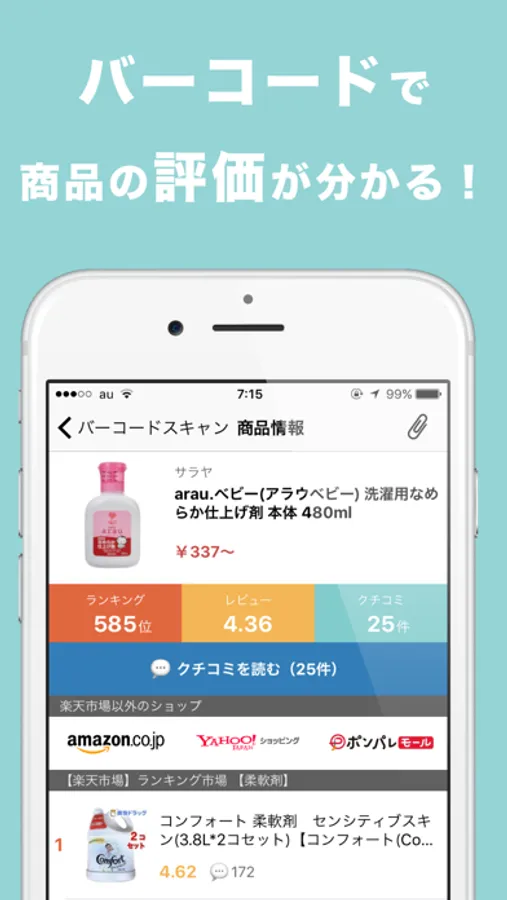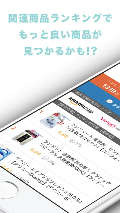 商品の口コミやレビュー、ランキングを簡単に検索できます。さらに、楽天市場、Amazon、Yahoo!ショッピング、ポンパレモールでの商品購入も可能です。