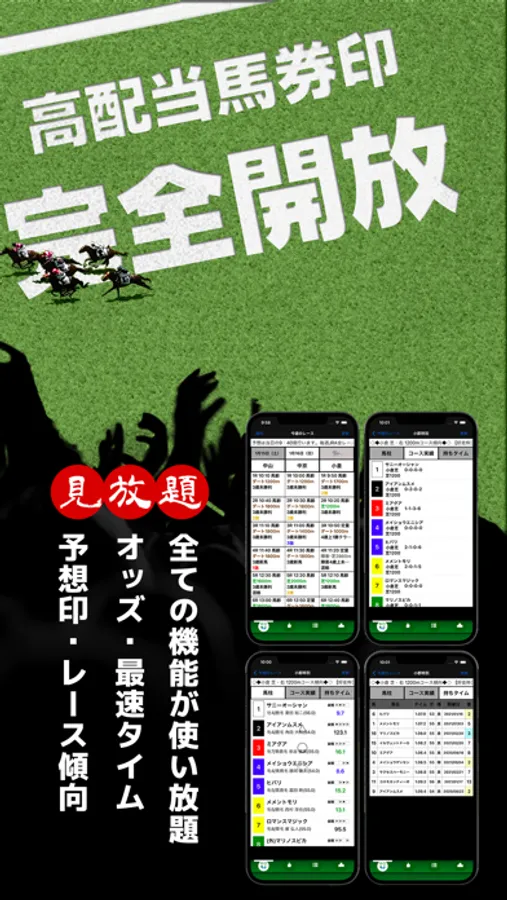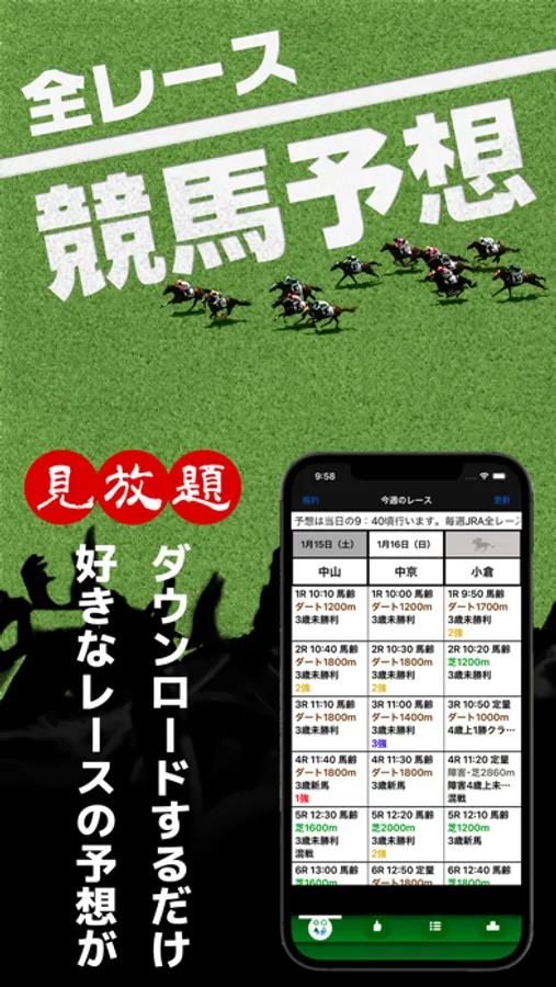 全レースの予想を無料で公開しています。馬柱にはオッズを表示し人気馬が一目瞭然。また一覧では「1強」「混戦」などレース展開も予想しています。