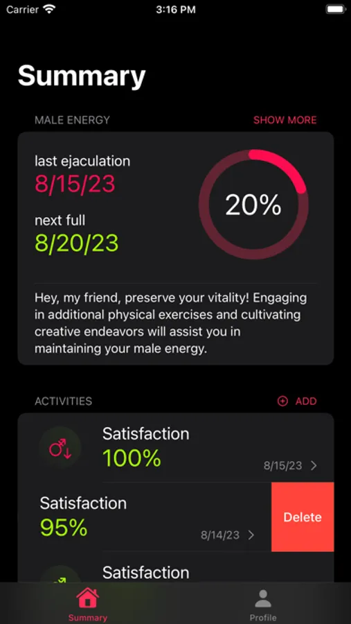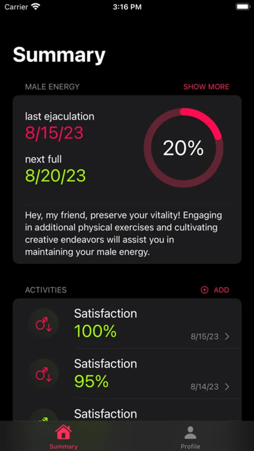 This app is designed to help you track your current level of male sexual energy based on your age and sexual activity. Your sexual energy is restored every day through the vitality of your body, but the rate of restoration varies depending on your age. Older men may experience a slower restoration rate compared to younger men. If your energy level is below 100%, it is recommended that you engage in sexual activity without ejaculation to preserve your body's valuable resources.