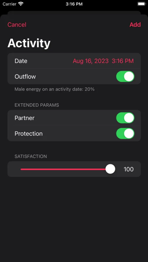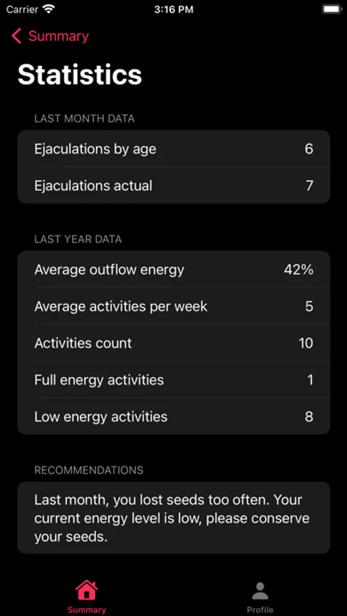This application offers a variety of features, including the ability to record and track your sexual activity by integrating with the "Health" app. You can also view a visual representation of your sexual energy levels over the past month and receive personalized recommendations based on your age and sexual activity.
