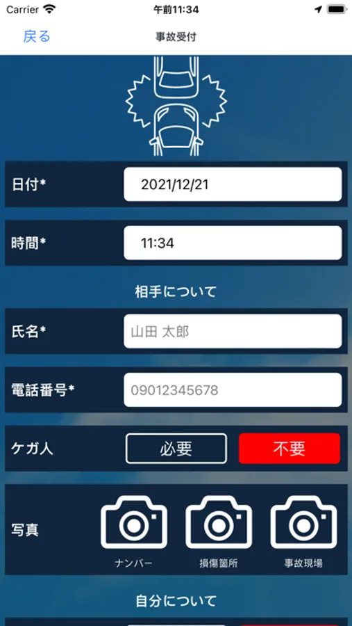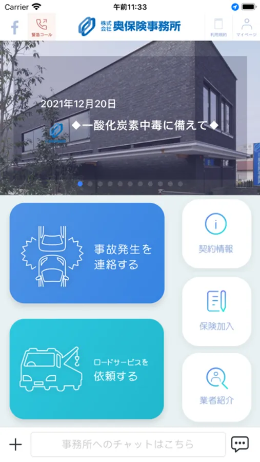 自動車事故・火災・賠償責任事故など、加入されている契約についての事故受付に必要な情報を手軽に奥保険事務所に送ることができます。自動車事故の場合は写真や位置情報を送ることで迅速な対応に寄与することができます。