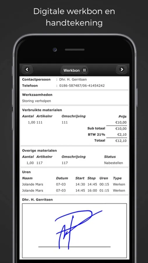Relyon Mobile is dé app voor service op locatie, ook zonder internetverbinding. Servicemonteurs vullen de werkbon volledig digitaal in door het registreren van uren, verbruikte materialen en het maken van foto’s. De app geeft toegang tot de servicehistorie en vanuit de backoffice kunnen documenten en tekeningen aan de opdracht worden gekoppeld. Zo is alle klantinformatie op locatie beschikbaar. Ook inspectielijsten en andere formulieren kunnen worden ingevuld via de app. Relyon Mobile maakt al uw papierwerk overbodig!