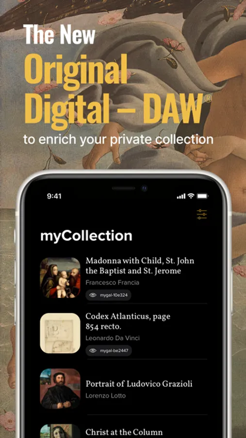 Each DAW® is a digital multiple of a masterpiece of art history, produced in original size in a limited series. The works are authenticated, certified and protected with a patented digital encryption system.
